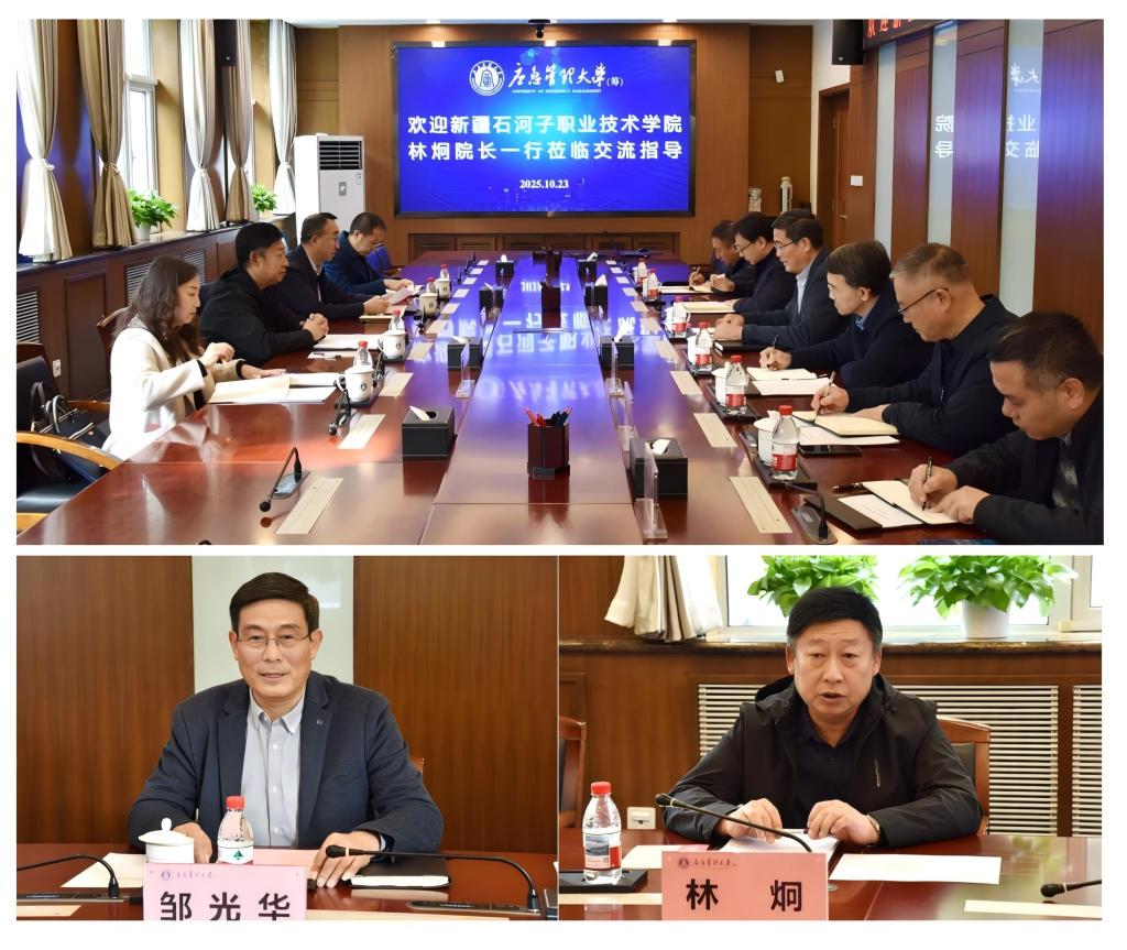 10 月 23 日上午,新疆石河子职业技术学院党委副书记、院长林 炯率调研组一行 4 人莅临我校,围绕深化校际合作、应急和安全类 专业申报、教育培训协同等议题开展调研交流。学校联合党委常 委、副校长邹光华会见调研组,双方进行深入会谈。